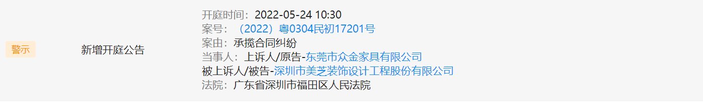 ? ? ? ?乐居财经讯 5月24日,深圳市美芝装饰设计工程股份有限公司(以下简称“美芝股份”)新增1则开庭公告,案由系承揽合同纠纷。案件原告为东莞市众金家具有限公司(以下简称“众金家具”),案件被告美芝股份。案件案号(2022)粤0304民初号。